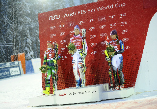 El podi de Levi, amb Hoefl-Riesch al centre, flanquejada per Poutiainen i Shiffrin.